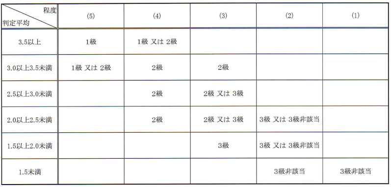 このガイドラインは、診断書裏面にある「日常生活能力の判定」を数値化して出した7項目の平均値と「日常生活能力の程度」をそれぞれ下記の表にあてはめて、障害等級1級~3級の判断を行います。(※ガイドラインはあくまで目安となっています。)