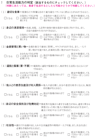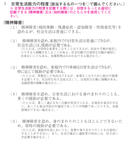 診断書裏面にある「3日常生活能力の程度」のことです。5段階評価のどれに該当するのかを医師が判断します。