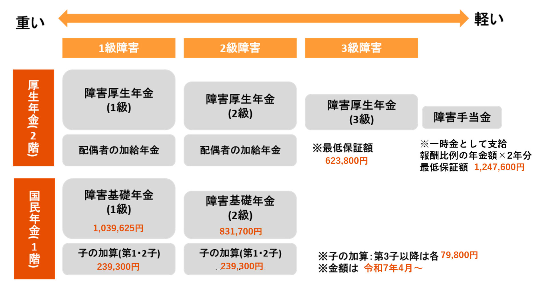 障害年金の等級は1級から3級まであり、それぞれの障害の程度は次の通りです。